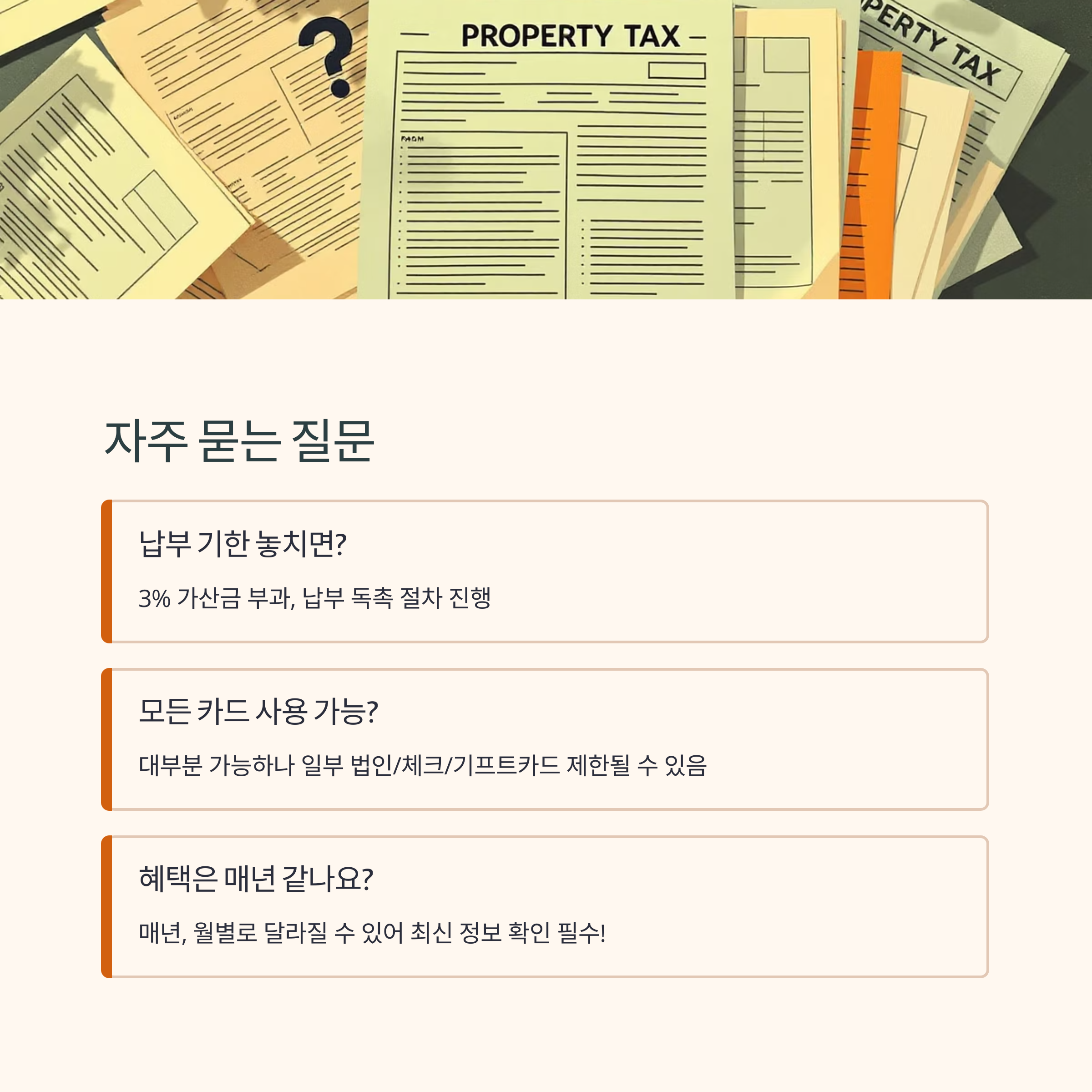 Q1: 재산세 카드 납부 시 수수료가 있나요? A1: 아니요, 재산세를 신용카드로 납부할 때 별도의 납부대행 수수료는 발생하지 않습니다. 이 점이 현금 납부보다 카드 납부가 유리한 이유 중 하나입니다.