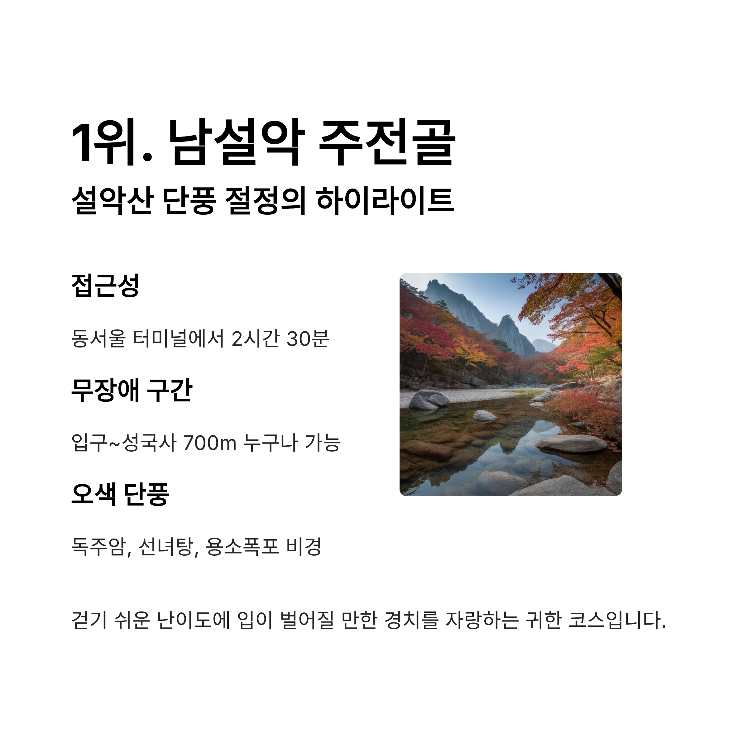 대망의 1위는 남설악의 대표 단풍 명소, 주전골 코스입니다. 설악산이지만 걷기 쉬운 난이도에 입이 벌어질 만한 경치를 자랑하는 귀한 코스입니다. 동서울 터미널에서 오색행 버스를 타면 환승 없이 약 2시간 30분 만에 도착합니다.