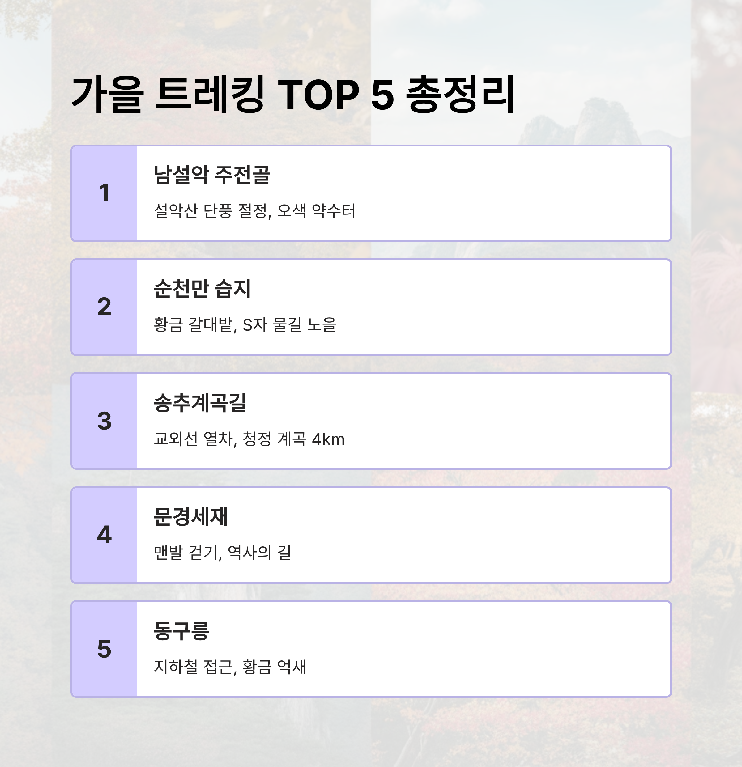 그래서 오늘은 제가 직접 경험하고, 대중교통으로도 충분히 당일치기 여행이 가능하며, 걷기 쉽고 주변 인프라까지 갖춘 국내 트레킹 여행지 TOP 5를 엄선해서 소개해 드리려 합니다. 순위가 올라갈수록 제가 더 강력하게 추천하는 '인생 가을 여행지'이니, 올가을 어디로 떠날지 고민이시라면 스크롤을 끝까지 놓치지 마세요!