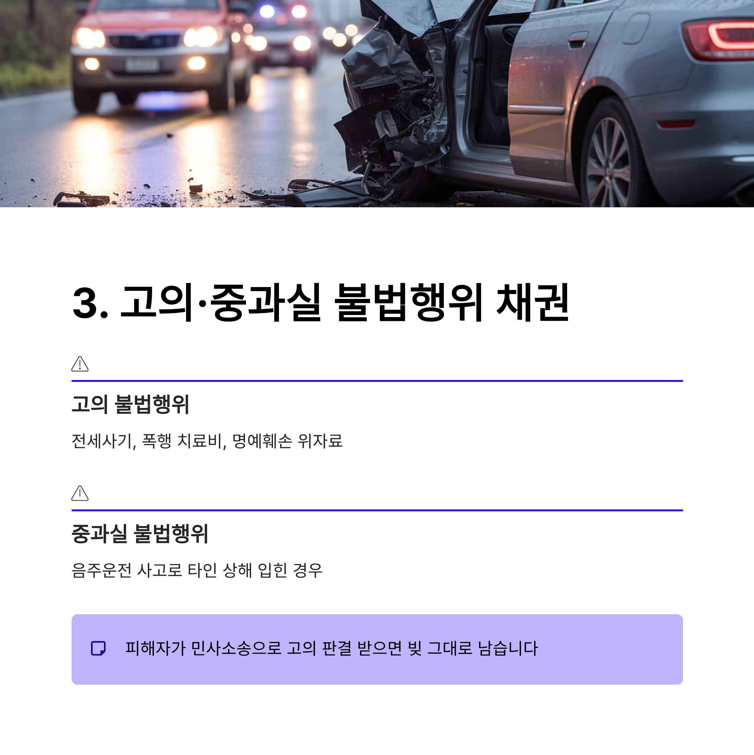 - 고의 불법행위: 전세 사기 피해금, 폭행으로 인한 치료비 및 위자료, 명예훼손 위자료 등.