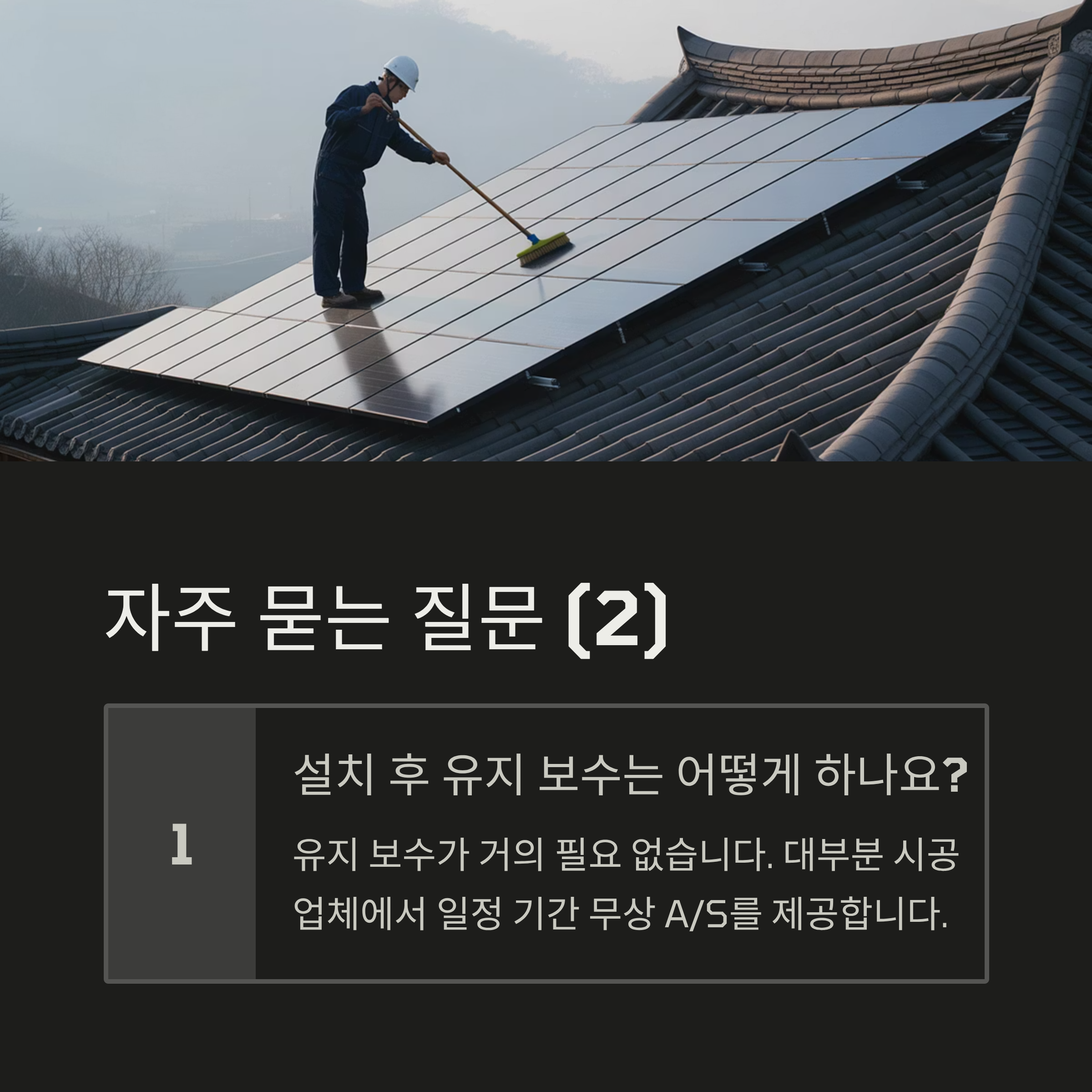 Q. 설치 후 유지 보수는 어떻게 하나요? A. 태양광 패널은 내구성이 뛰어나고 별도의 움직이는 부품이 없어 유지 보수가 거의 필요하지 않습니다. 간혹 먼지가 쌓일 경우 빗물에 자연적으로 씻겨 나가지만, 필요하다면 간단한 물청소를 통해 효율을 관리할 수 있습니다. 대부분의 시공업체에서 일정 기간 무상 A/S를 제공하니 이 부분을 잘 확인하고 계약하면 좋습니다.