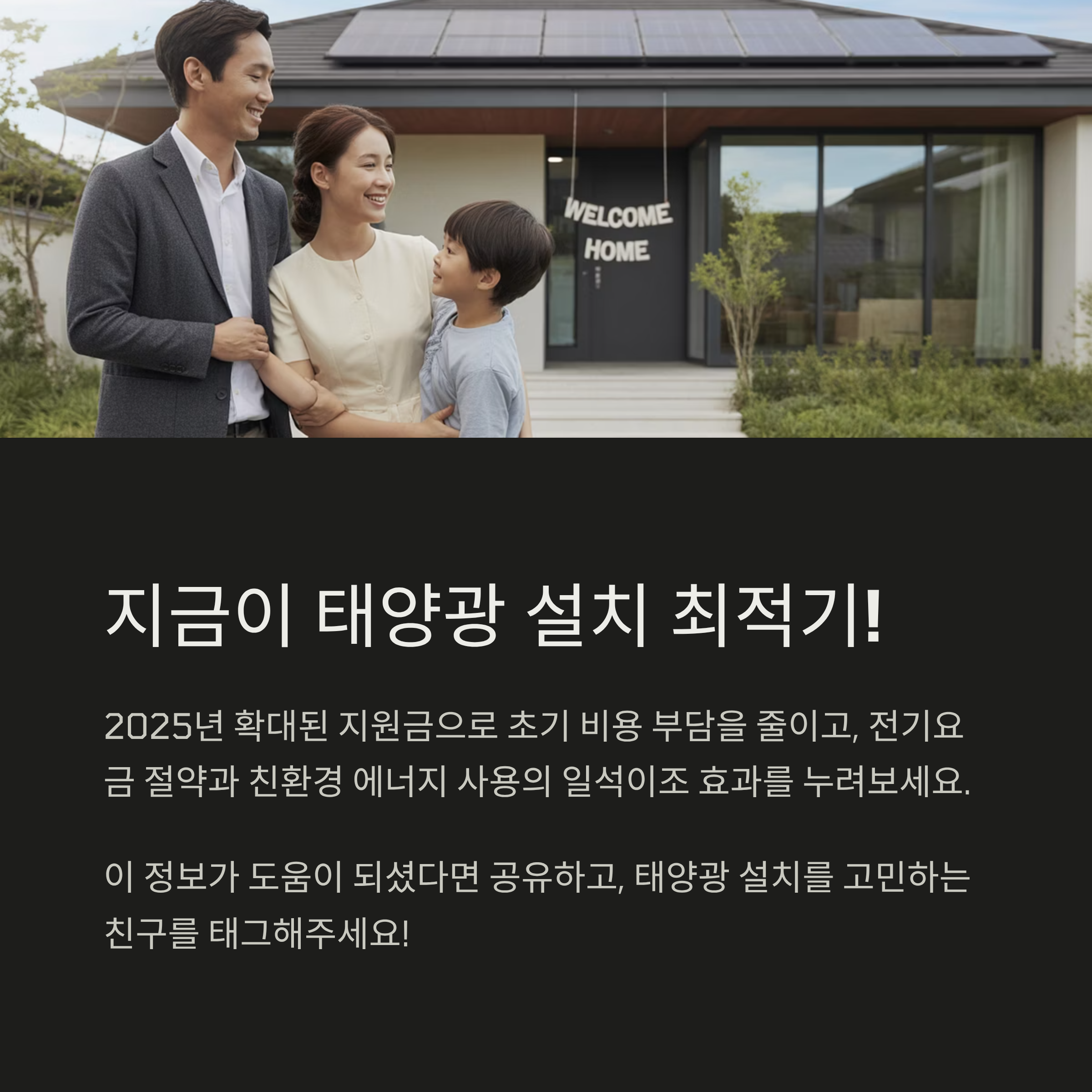 우리 집도 태양광 설치를 고민하고 있다면, 2025년은 지원금 확대와 함께 좋은 기회가 될 수 있습니다. 초기 비용 부담을 덜고, 꾸준한 전기 요금 절약 효과와 함께 깨끗한 에너지 사용에 동참하는 일석이조의 효과를 누려보세요!
